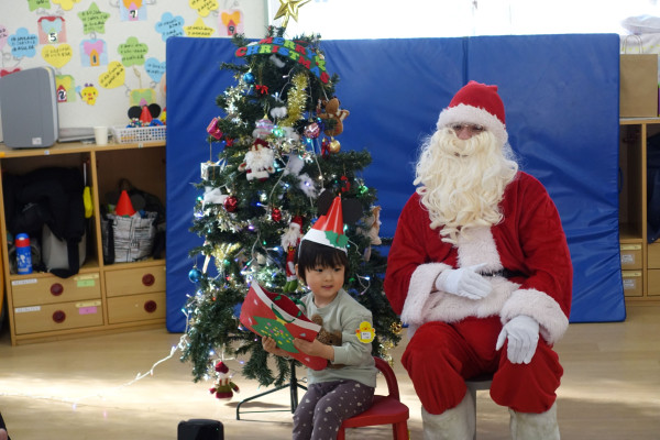 今週のひよこ教室はクリスマス会を楽しみました。なんとひよこ教室にも本物のサンタさんがプレゼントを持って来てくれました。明日12月22日幼稚園は2学期終業式ですが、幼稚園の各お部屋(いちご組から年長組まで)にもサンタさんが