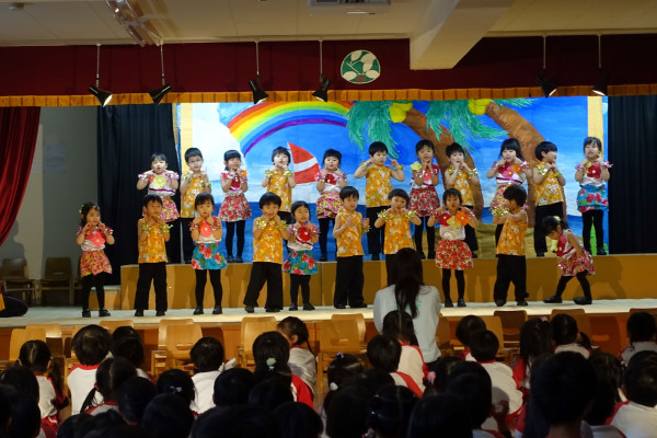 来週土曜日の2月17日には、幼稚園内ホールにおいてクラスごとの「おゆうぎ会」が予定されています。一年間の集大成にふさわしく歌や踊り、セリフ等を楽しみながら、そして自分達の成長を実感しながら演じます。そのリハーサルが本日より3日間行われています。本番同様の衣装をつけ、また他のクラスの子ども達はお客さんになってみんなで一つのものを作り上げる取組みとなっています。