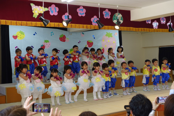 昨年4月より始まった2歳児(満3歳児)クラス、いちご組のお友達のおゆうぎ会が幼稚園ホールにて行われました。普段広い園庭で元気に遊び、年少以上のお兄さんお姉さんとも元気に遊び、いろいろなお世話もしてもらい、集団生活における様々なことがしっかりでき、大きく成長いたしました。49名のいちご組さんは、うさぎ、ぞうグループに分かれて、一年間の集大成にふさわしくにこにこ笑顔で楽しく踊ることができました。