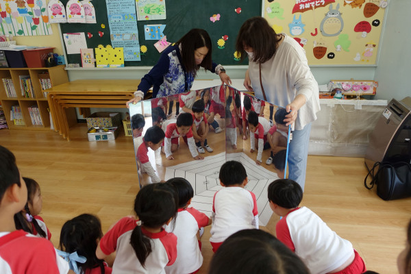 緑ケ丘幼稚園では大切な幼児期には広い園庭で伸び伸びと多くのお友達と元気に遊ぶと共に、人生の基礎土台である非認知能力を培うために様々な体験活動を大切にしております。本日その一つである「かがくタイム」を年長さんは行いました。本日のテーマは「鏡の不思議ワールドへようこそ!」で、大きな鏡2枚を使って様々なものを映しだしたり、個人用(お持ち帰り)の小さな2枚の鏡で不思議シートや人形を映して遊び、そのなかで子ども達が考え、意見を出し合うアクティブラーニングの機会も数多くあり、今後の学びへのきっかけになりました。