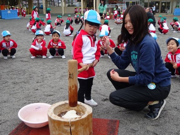昨夜からの雨が早朝には止み、それほど寒くもない適度な陽気のなか、日本古来文化の一つである「おもちつき」をみんなで楽しく行いました。お米からおもちができあかる様子を子ども達は興味津々で観察し、本部役員のお父様や古内先生、バスの運転手さんが杵でつく時には「よいしょ」と掛け声を出していました。園庭では、子ども達のつき用のおもちを全員つき、楽しい体験が出来ました。つきたてのおもちは美味しそうに食べていました。幼児期においては、様々な体験をして、日本の伝統文化を理解し、国際社会において日本人としてのプライドと自覚をもってほしいと願っています。役員のお母様や本部役員様やお父様方、お手伝いありがとうございました。ちなみに今年ももち米は100キロでした。