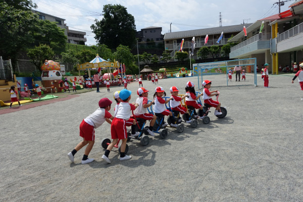 緑ケ丘幼稚園の広い園庭では、お砂場や様々な遊具、そして三輪車等様で楽しく遊んでいます。特に三輪車をいくつもつなげて年長から年少までのお友達が仲良く力を合わせて遊ぶ微笑ましい姿が見られます。