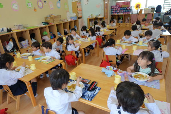 きょうも昨日に続き、五月晴れの良い天気となり、いちご組(2歳児)から年長組まで全園児が広い園庭で元気に遊んでいました。また年中一部クラスはavexリーコ先生によるダンス指導も行われ、からだを音楽に合わせて動かす楽しさを体験できました。昼食では、全園児各クラスで配膳する温かいカレーバイキング(希望制)が行われ、子ども達は大喜びで何杯もおかわりする場面も見られました。緑ケ丘幼稚園では今年度食育の一環として、毎月このようなイベントを計画し、6月はお野菜いっぱいの温かい中華丼バイキングを予定しております。