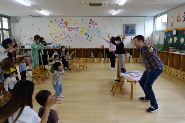 緑ケ丘幼稚園では2歳児ひよこ教室の特別コースとして、外国人講師アダム先生による英語コースも始まっています。本日も陽気で明るく、様々な表情を見せてくれるアダム先生(ご出身イギリス)が音楽に合わせてからだを動かしたり、カードを見ながら様々な発音を紹介し、とても楽しいひと時となっています。