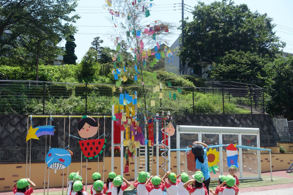 今日も猛暑が続き、子ども達は朝も含めて、一日冷房の効いた保育室で楽しく過ごしていました。明後日7日が日曜日のため、本日いちご組を含め全園児で「七夕まつり」を行いました。毎年恒例の緑ケ丘幼稚園じまえの大きな竹に、保育のなかで願い事を書いた短冊をつけ、みんなで七夕のうたを元気に歌いました。私のお話もとても良く聞け、みんな本当に大きくなりました。みんなの願い事が叶いますように。