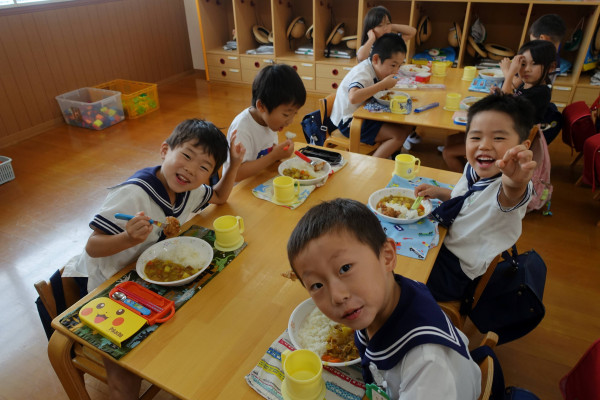 1学期も残りわずかとなってきましたが、子ども達はとても元気で園生活を楽しんでいます。きょうのお昼での給食は各お部屋で配膳する「カレーバイキング」で、お替わりするお友達もいました。緑ケ丘幼稚園では、食育の一環として毎月一回このようなバイキング方式の給食も取り入れています。9月は麻婆豆腐丼を予定しています。
