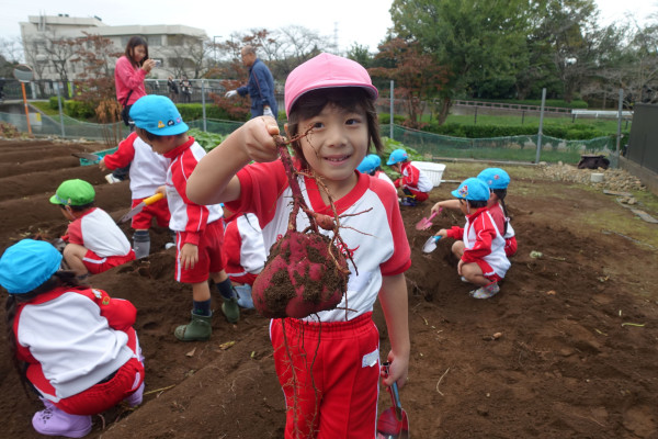 本日は以前学年ごとに生育状況を観察し、お散歩をしたさつまいもをいちご組も含め、全園児で掘りに行きました。いちご組は幼稚園バスで行き、年少以上は幼稚園からお散歩をして向かい、観察した時は葉やツルがたくさんありましたが、本日は農家の方がきれいに刈り取り、フカフカのお山のような状態になった所を掘ることができました。大きなおいもが見つかる度に「あったー」と歓声があがっていました。秋の実りを実感する良い機会となりました。豊作のため、お家に持ち帰りができましたので、ぜひご賞味ください。