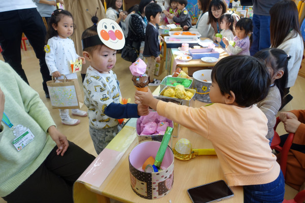 朝晩は真冬並みの寒さが感じられるここ数日ですが、日中は幼稚園の広い園庭全面に日が当たり、子ども達は日だまりのなか元気に遊んでいました。音楽会の練習にも楽しく取組んでいます。今週のひよこ教室(2歳児親子登園コース)は、毎年大好評のお店屋さんごっこです。今年のメニューは「アイス」「ハンバーガー」「シェイク」「ケーキ」そして「お面」の5店舗で、全て本物仕様でお持ち帰りができ、子ども達はお客さんとお店屋さん交替で遊び素敵な楽しい体験となっています。明日はいちご組(2歳児在園児)にて同メニューを子ども達だけで行う予定です。