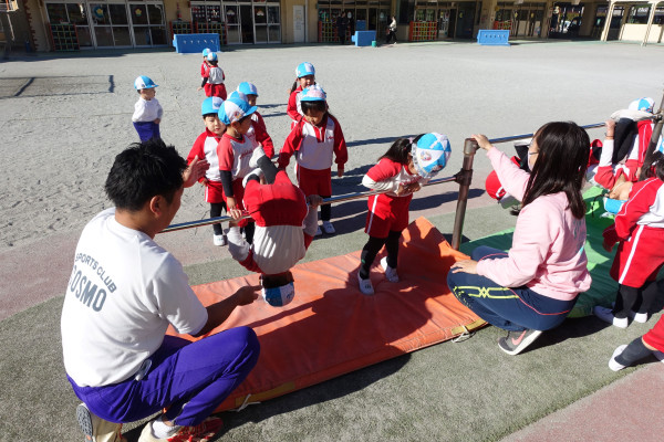 > 広い園庭での体育指導では鉄棒に挑戦!(年少)