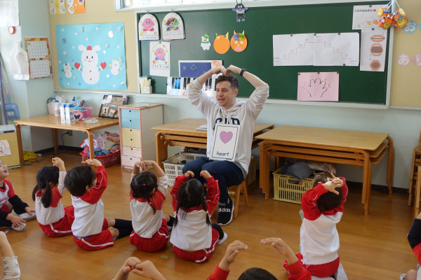 外国人講師アダム先生の英会話指導に楽しく参加できました(年少)