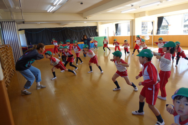 本日は年長一部クラスのリーコ先生によるダンス指導がとても楽しく行われました。今大流行のCreepy Nutsの曲を速いテンポに合わせて、子ども達は一生懸命頑張っていました。来月2月27日(木)に自由服を着てのダンス発表会も予定されています。