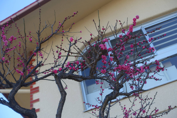 正門付近の紅梅がまもなく満開となります