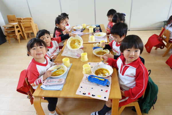 緑ケ丘幼稚園では食のニーズの多様化に伴い、毎日お弁当または給食を自由に選択できるようになっています。そして月1回はカレーや麻婆豆腐丼、シチュー等の温かいバイキングを行っていますが、本日今年度最後のバイキングでした。お替わりをするお友達も多く、いちご組(満3歳児)さんも全員カレーで、みんな美味しくいただいていました。いっぱい食べて、すくすく成長してください。