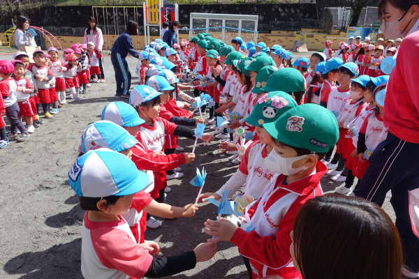 卒園式、終了式前としては最後の一日保育となりました。みんなで一年間楽しく遊び、様々なことに力を合わせて頑張ったことに感謝の気持ちを持ち、みんなで「ありがとう」とお別れ会を行いました。広い園庭には在籍児412名が並び、プレゼント交換やおうたを歌いました。みんな心身共に大きく成長いたしました。いよいよ明日は卒園式です。