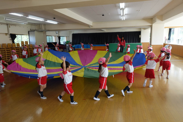 連休前の本日、子ども達は過ごしやすい陽気のなか、とても元気に過ごしていました。相変わらずビオトープにいるおたまじゃくしが大人気で、興味津々に観察するお友達が多かった様です。連休明け頃には足が生えて、カエルになっていくと思われます。緑ケ丘幼稚園では、沢山の鯉やうさぎ、メダカそして最近ではツバメも巣を作り始め、自然と関わる機会がとても多い環境となっています。本日の年中体育指導では、幼稚園ホールにて「バルーン」を楽しんでいました。まだ2回目ですが、様々なワザを覚え、みんなで力を合わせる楽しさを実感していました。