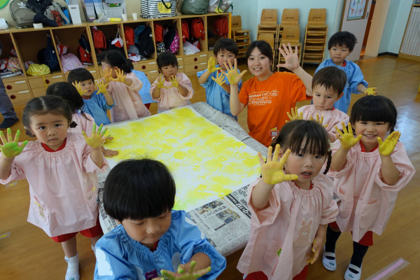 春の遠足を終え、心身共に一段と成長した子ども達は、暑くなってきた時期でも水分補給等をまめにとりながら元気に過ごしています。本日年少さんは「フィンガーペインティング」を楽しみました。緑ケ丘幼稚園では「絵画造形教育」を特色の一つとしていますが、その第一歩としてお手てに絵の具を好きなだけ塗って、大きな紙に好きなようにペッタンペッタンしました。この体験が今後の絵画造形活動に対して一層意欲的に取組むきっかけとなっています。