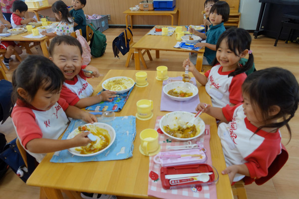 緑ケ丘幼稚園でのお昼はご家庭でのお弁当または給食を毎日自由に選べる形をとっており、食の多様化のなか好評いただいております。本日は月1回の温かいカレー等のバイキングの日で、各お部屋で担任が配膳し、温かいカレーを好きなだけ食べることができました。何回もおかわりするお友達も多く、とても楽しいランチタイムとなりました。