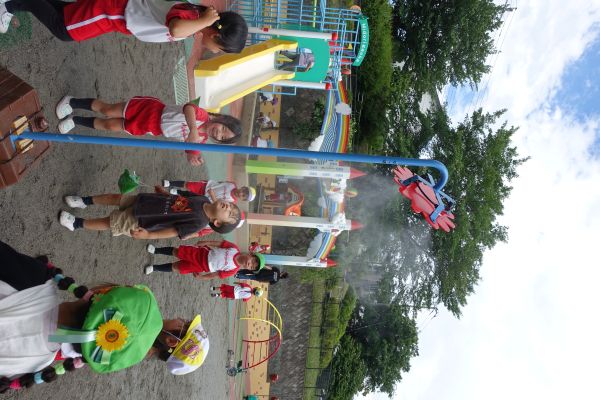 今週も子ども達は元気いっぱいに過ごしています。本日から広い園庭2か所に「ミストシャワー」が設置されました。子ども達は早速涼み始め、楽しんでいました。