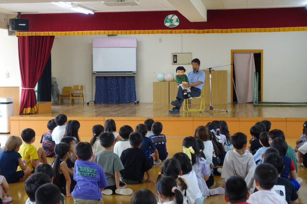 本日は今年3月に卒園した小学校1年生のお友達が遊びに来てくれました。みんなとても元気で更に大きくたくましく成長した姿に嬉しく思いました。集合写真撮影後、広いホールにて私のお話を聞いた後は、大きな紙芝居、トンちゃんそして様々なゲームを楽しみました。各お部屋では久しぶりに会えたお友達といっぱいお話ができたようです。お昼のカレーライスバイキングは大好評で、おかわりするお友達もたくさんいました。幼稚園は卒園生にとって、これからもずっとふるさとです。いつでも遊びに来て下さい。
