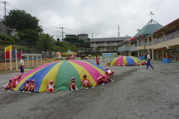 今週も猛暑続きでしたが、本日は曇り空で時折雨の降る過ごしやすい一日となり、久しぶりに年中のお友達は園庭に出て成田先生の体育指導を行い、バルーンやかけっこを楽しんでいました。バルーンの様々な振付けも大分覚えたようで、一つひとつを自分で考え判断し、主体的に取組む姿が見られました。
