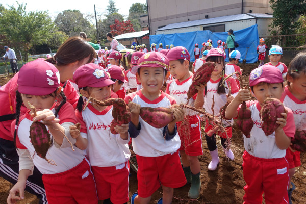 先週金曜日の秋の遠足(多摩動物公園)に続き、本日は以前生育状況を観察した「さつまいも」をみんなで掘りに行きました。さつまいも畑は、幼稚園から徒歩で15分の所にあるため、いちご組(年少少)は往復園バスで、年少以上はお散歩して行きました。前回のさつもいも観察の際は、たくさんのツルや葉が見られましたが、その後全て刈り取られ、とても掘りやすい状態で、おいも掘りができました。秋の実りを体験し、自然を五感で直接楽しむ良い機会となりました。