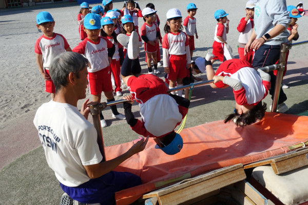 年中のお友達は只今体育指導で「逆上がり」に挑戦! 様々な工夫をしながら子ども達は何回も取組み、いずれできるようになった時には「自信」につながります。緑ケ丘幼稚園では卒園までには全員逆上がりができることを目標として、遊びのなかで楽しみながら頑張っています。