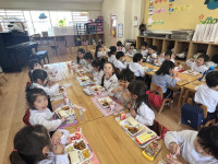 2020年から感染防止のために、昼食時やファミリークラスおやつ時にはパーテーションを使用して仕切りの...