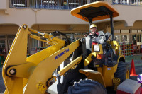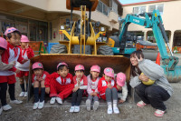 只今園庭は人工芝敷設工事が行われ、様々な重機が入っています。今回特別に工事業者の協力、ご厚意によ...