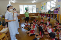 歯の生え変わりの時期を迎える年長さんは、本日東邦歯科医療専門学校の学生の皆さんから各保育室にて歯...