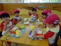 いちご組のお友達も日に日に集団生活に慣れ、お昼もみんなで楽しく美味しくいただいています。
